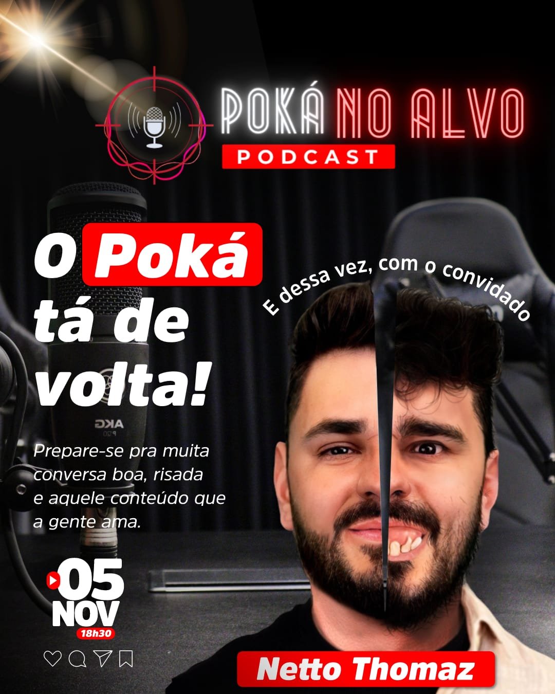 O "Póka No Alvo Podcast" está de volta com tudo! Após uma pausa, o programa promete trazer muita conversa boa, risadas e aquele conteúdo que o público já conhece e adora. Na próxima edição, marcada para o dia 5 de novembro, o podcast recebe um convidado especial: o influencer e criador de conteúdo Netto Thomaz.